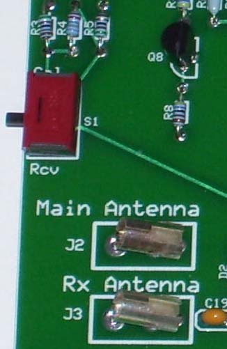 One of the hallmarks of kitbuilding has always been the ability to work on your radio yourself to avoid the hassle and expense of returning the product for service or alignment. One is shown here -- flipping this switch on the "RxBPF" board and connecting the transmitter's local oscillator signal at 10.7MHz to the main or receive antenna jack feeds an S9 signal into the receiver, allowing you to cal the S-meter. By connecting the output to any shortwave receiver, you can also test the preamps, attenuator and antenna inputs before stacking the receiver board on top.