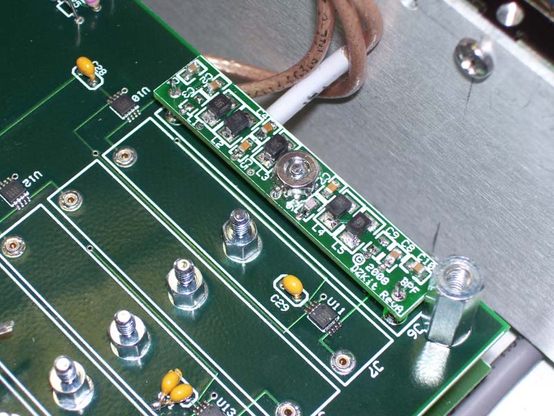 Receive bandpass filters are implemented using surface mount inductors and chip capacitors, and each one is switched in via Hittite HMC349 GaAsFET SPDT switches. These devices have an IP3 of +50dBm and 70dB of channel-to-channel isolation, providing plenty of margin for large signals with low distortion. And exclusively with the DZKit Sienna, you can bypass these filters, resulting in about 5dB less loss. The increased bandwidth going into the receiver can cause higher IMD and more out-of-band mixing products, so it's not something you want to keep enabled, but when you're trying to extract the last dB of signal from a weak station, it can help. We call it "PassiveSignalBoost (PSB)TM". There are 11 bands of these filters covering 500KHz-30MHz for the receiver, and 10 for the transmitter, covering the 10 ham bands in that frequency range (and since they snap in, we can make them handle any transmit frequency range you need). The transmitter does not share the same bandpass filters as the receiver (a requirement for full duplex operation), so there's no effect on transmit performance when using PSB. These filters snap into the transmitter board and the receiver's "RXBPF" board. Here's a photo: Two RF preamps can be switched in after the bandpass filters. These utilize 2N5109 NPN transistors. Each provides about 10dB of low-noise gain. There is also a 10dB attenuator accessible from the Pre2/Atten button on the front panel -- with Pre1 off, press Pre2/Atten for 10dB of attenuaton. A noise blanker with a variable threshold and three selectable pulse widths is located after the 2nd mixer, at 9MHz, prior to the crystal filters, to catch as much wideband noise as possible. This NB, like most NB's, is designed to eliminate strong impulse-type noise, such as that caused by light dimmers, automobile ignitions or electric fences. It is not intended to conquer the Russian Woodpecker or other low-level noise. Secondary Receiver/Panadapter Many hams like to use secondary receivers as "spotting" receivers, which is very useful in contests for finding new multipliers by listening to one receiver in one ear while operating on another frequency and listening in the other ear. A secondary receiver is also useful for comparing antenna performance - use the main antenna on one receiver while listening to another antenna on the other receiver. Unfortunately, it can be very difficult to optimize both receivers for best dynamic range, IMD and sensitivity when both are operating in the same enclosure and having simultaneously operating local oscillators. The secondary receiver also usually suffers from a lack of independent front panel controls due to space and cost concerns. Even some of the very expensive rigs have eliminated an internal secondary receiver, and other manufacturers are struggling with their designs too. We actually had a secondary receiver in the Sienna during its early design phases, but we removed it for just these reasons. It was too big a compromise.Instead, we chose to support the addition of an inexpensive external secondary receiver that can be controlled by a PC, thus giving you complete control over that receiver with an independent set of controls, and eliminating any performance issues due to cramming too much inside one rig. You can use either an additional receive-only Sienna (S-100 or SF-100 with a PC) or an RFSpace SDR-IQ. The latter is a very good receiver that Sienna can control directly from a PC. The SDR-IQ also can be used as a spectrum display (panadapter) by connecting it to the 455 kHz IF output . The secondary receiver's speaker output can be fed into the line-in jack on Sienna's back panel, and then fed to the left speaker when the front panel "dual" button is pushed, with Sienna's own internal receiver going to the right speaker. We think this is a much better way to handle secondary receive capabilities. If you don't use this type of functionality, you don't have to pay for the needed infrastructure inside the rig and you get a much better receiver that's easier to control too. All circuitry is tried and true analog design. We purposely chose not to use IF DSP (digital signal processing) or SDR (software-defined radio) techniques which are still an evolving art form. DSP means that intermediate frequency signals (usually at a low IF such as 15KHz) can be processed digitally in special high speed chips that implement filter functions in software. SDR means that many of the radio's mixers, oscillators, amplifiers and filters are implemented in software, using math routines. Typically, a signal is sampled at a very high rate with an A/D converter, and the resulting samples are then run through algorithms to, say, create the sum and difference products after multiplication by a cosine function, or to implement a bandpass filter. The demodulated signal is then converted back into a digital stream that is fed to a digital to analog converter (DAC) which drives the speakers. The transmitter can also be implemented in software, at least up to the power output stages. As a sampled system, care must be taken to avoid aliasing effects. One side-effect of SDR is that since so much functionality is done in firmware (software that is stored in read-only-memory), it can easily fall into the software trap of being "never done", forcing you to download new code periodically until the designer "gets it right". Modern transceivers, including Sienna, allow the user to download new firmware into the microprocessor. But Sienna's firmware is only used to control the analog hardware, not to implement the bulk of the radio. As a result, when it is shipped, all functions are working and tested. You will never have to download new firmware to get features that you paid for months earlier. We believe that firmware updates should be used to fix bugs or add new features not previously advertised, not to complete the radio's advertised features. We will not take your money and then ship you an unfi