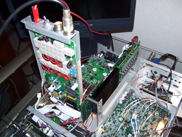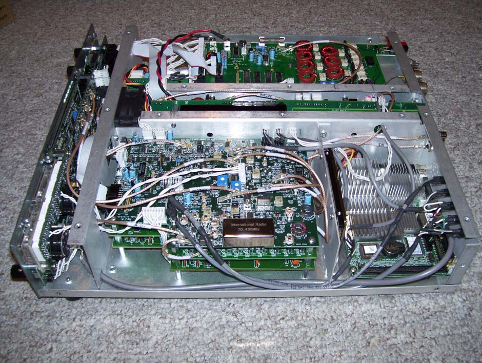Sienna also has excellent built-in servicing capabilities. The picture below shows two such features. When the unit is bolted together, the tuner and dc power distribution board ("DCD/Tuner") sits above the 100W power amplifier. To get at the amplifier, the tray holding the DCD/Tuner can be rotated up and locked into a vertical position. And the transmitter can be moved up out of its center compartment for easy access to its components.